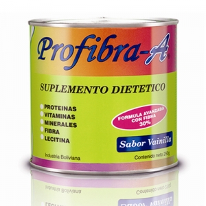 Profibra - A Forma Farmaceútica: Polvo Acción Terapeútica: Suplemento dietético Principio Activo: Vitaminas y Minerales, Proteínas de Soya al 50%, Lecitina, Fibra Soluble e Insoluble al 30% Presentación:Lata x 250 g Registro Sanitario: NN-24420/2012 Presentación: Lata x 250 g Posología: 2 a 4 cucharadas colmadas al día (proporcionan 15 a 30 g de proteínas de alta calidad. Indicaciones: SUPLEMENTO DIETÉTICO COMPLETO indicado en la preparación de formulaciones en terapias de adelgazamiento y mantenimiento del peso normal, así como en pacientes que necesitan un DIETA suplementada con FIBRA. Contraindicaciones: Hipersensibilidad a los componentes de la formulación. Efectos Secundarios: Porfibra - A, generalmente es bien tolerado. Industria: Boliviana
