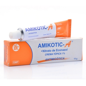 Amikotic - A Forma Farmaceútica: Crema Acción Terapeútica: Antimicotico de amplio espectro Principio Activo: Nitrato de Econazol al 1% Presentación:Tubo x 15 g Registro Sanitario: NN-24421/2012 Presentación: Tubo x 15 g Posología: Aplicar 2 a 3 veces al día en el área afectada, según prescripción médica. Indicaciones: Dermatomicosis de la piel y mucosas. Contraindicaciones: Hipersensibilidad al principio activo. Efectos Secundarios: Amikotic - A, generalmente es bien tolerado. Industria: Boliviana