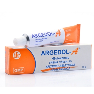 Argedol - A Forma Farmaceútica: Crema Acción Terapeútica: Miorelajante, Anti-inflamatoria, Analgésica Principio Activo: Bufexamac al 5% Presentación:Tubo x 15 g Registro Sanitario: NN-24423/2012 Presentación: Tubo x 15 g Posología: Aplicar 2 a 3 veces al día en el área afectada, según prescripción médica. Indicaciones: Afecciones reumáticas y traumatismos de todo tipo. Contraindicaciones: Hipersensibilidad a los componentes de la formulación. Efectos Secundarios: Respetando la dosis no se observan. Industria: Boliviana