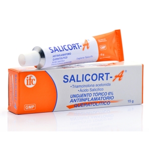 Salicort - A Forma Farmaceútica: Ungüento Acción Terapeútica: Queratolítica, Anti-inflamatoria Principio Activo: Acetonida de Triamcinolona al 0,05%, Ac. Salicílico al 6% Presentación:Tubo x 15 g Registro Sanitario: NN-21338/2010 Presentación: Tubo x 15 g Posología: Aplicar 2 a 3 veces al día en el área afectada, según prescripción médica. Indicaciones: Dermatosis agudas Hiperqueratosis Contraindicaciones: Manifestaciones cutáneas de la tuberculosis, infecciones cutáneas por virus. Efectos Secundarios: Reacciones de hipersensibilidad al medicamento. El empleo de corticoides tópicos anti-inflamatorios en áreas infectadas debe hacerse con precaución. Si hay infección en los tejidos es recomendable el uso de un antibiótico apropiado. Industria: Boliviana