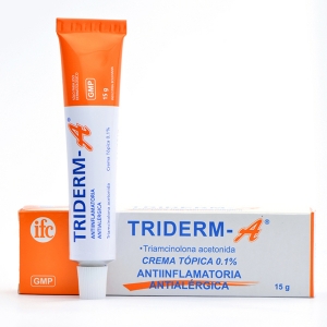 Triderm - A Forma Farmaceútica: Crema Acción Terapeútica: Antipruriginosa, Antialérgica, Anti-inflamatoria Principio Activo: Acetonida de Triamcinolona al 0,1% Presentación:Tubo x 15 g Registro Sanitario: NN-18803/2014 Presentación: Tubo x 15 g Posología: Aplicar 2 a 3veces al día en el área afectada, según prescripción médica. Indicaciones: Tratamiento de las dermatosis comunes, procesos inflamatorios, procesos alérgicos, prurito. Contraindicaciones: Manifestaciones cutáneas de la tuberculosis, infecciones cutáneas por virus. Efectos Secundarios: Reacciones de hipersensibilidad al medicamento. Triderm - A, generalmente es bien tolerado. Industria: Boliviana
