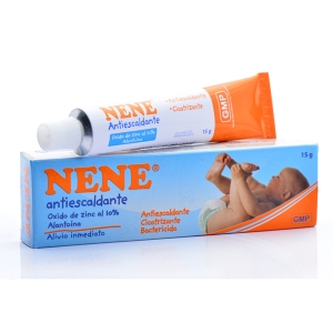 Nene Forma Farmaceútica: Ungüento Acción Terapeútica: Cicatrizante, Bactericida, Antiescaldante Principio Activo: Oxido de Zinc al 10%, Cloruro de Benzalconio, Alantoína Presentación:Tubo x 10 g Tubo x 15 g Registro Sanitario: NN-21339/2010 Presentación: Tubo x 10 g Tubo x 15 g Posología: Aplicar el ungüento, 2 a 3 veces al día en el área afectada. Indicaciones: Previene y cura las escaldaduras en todas sus formas. Contraindicaciones: Hipersensibilidad a los componentes de la formulación. Efectos Secundarios: Generalmente, Nene ungüento es bien tolerado. Industria: Boliviana